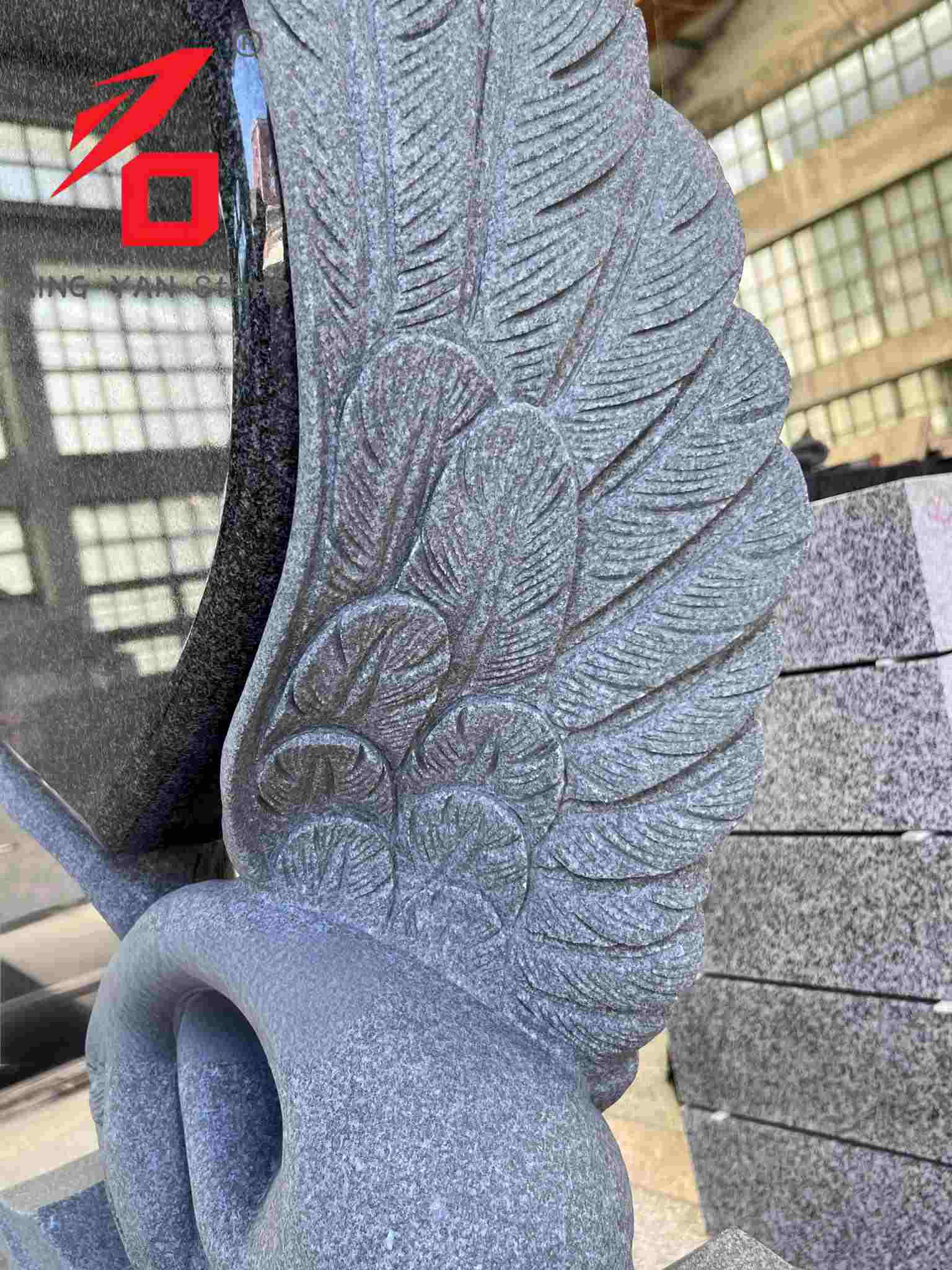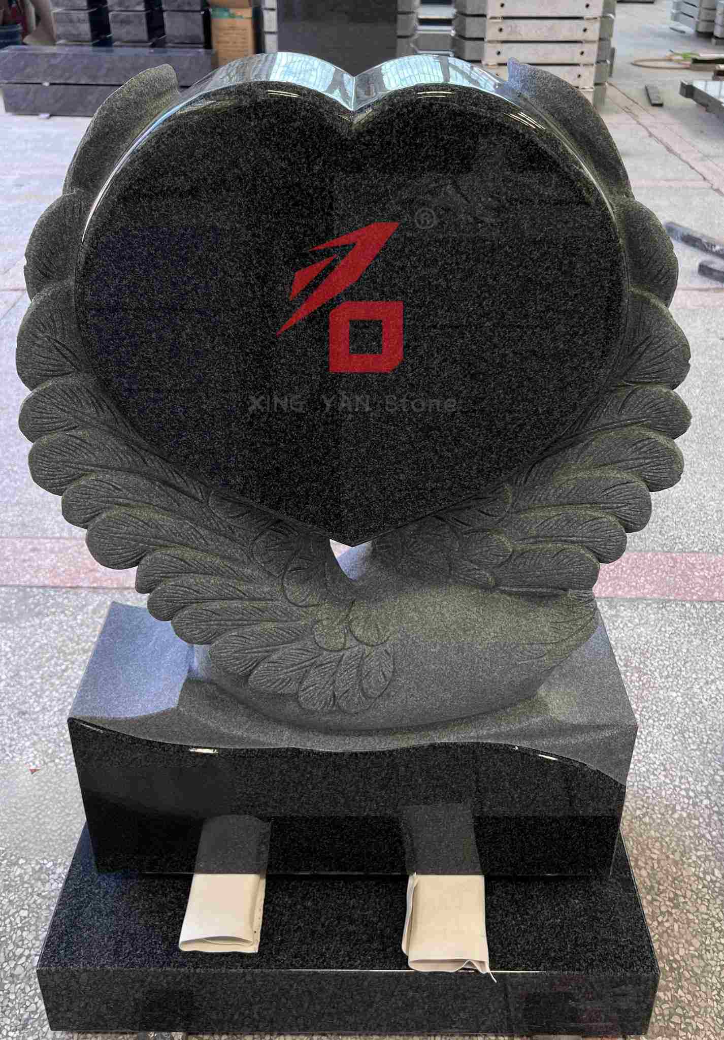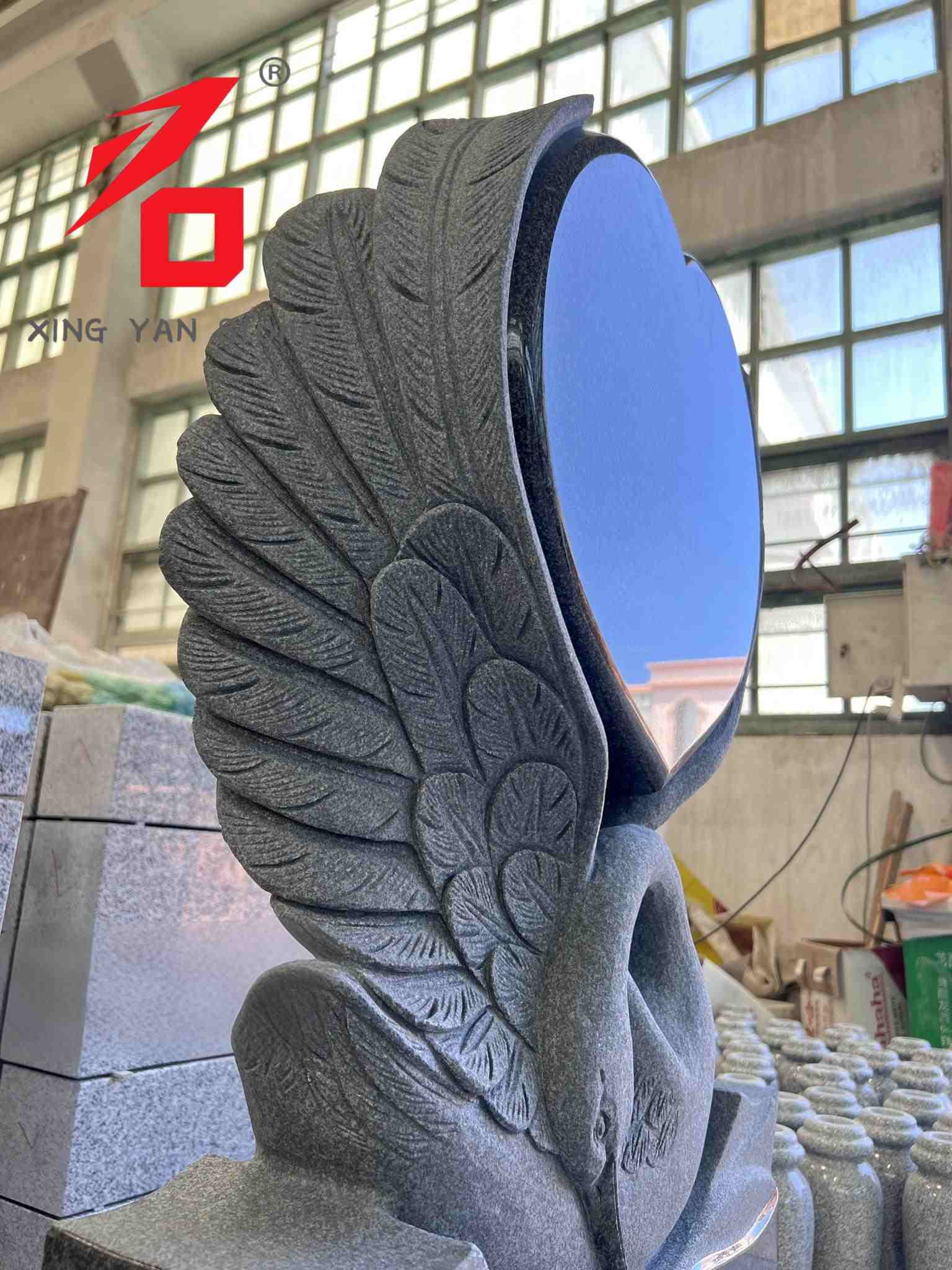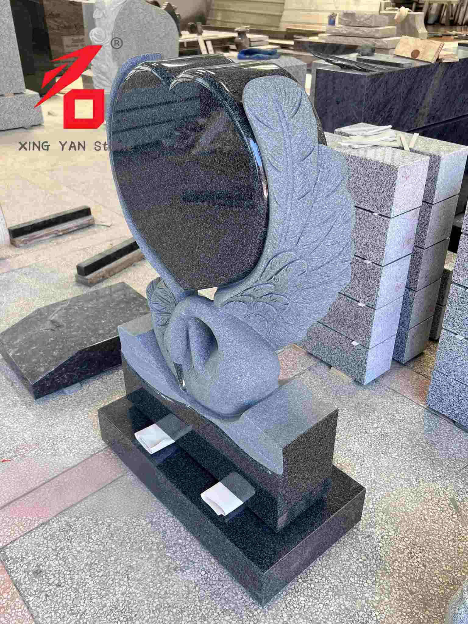 Design: Der Hauptkörper ist ein poliertes schwarzes Herz, hinter dem lebensechte Schwanenflügel eingraviert sind. Die Schwanenform und das Herz symbolisieren ewige Liebe und Erinnerung an den Verstorbenen. Das Gesamtdesign ist sehr künstlerisch und unterscheidet sich vom eintönigen Stil traditioneller Grabsteine.