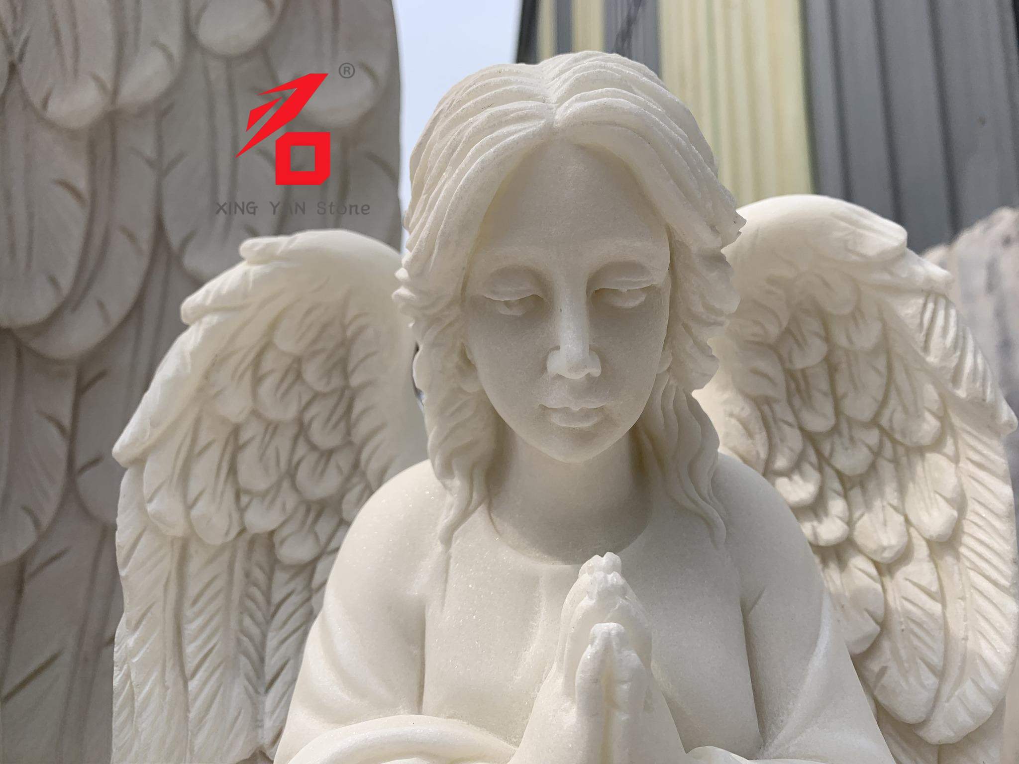Details zur Handwerkskunst: Die Oberfläche wurde von Steinmetzmeistern exquisit handgeschnitzt und poliert. Die Oberfläche ist glatt und zart und weist ausgewogene Proportionen auf. Jede Textur (Flügel, Falten der Kleidung) ist klar und natürlich und fängt die Sanftheit und Heiligkeit des Engels perfekt ein.
